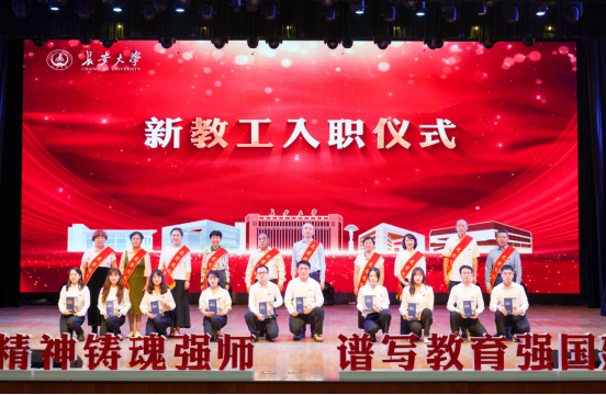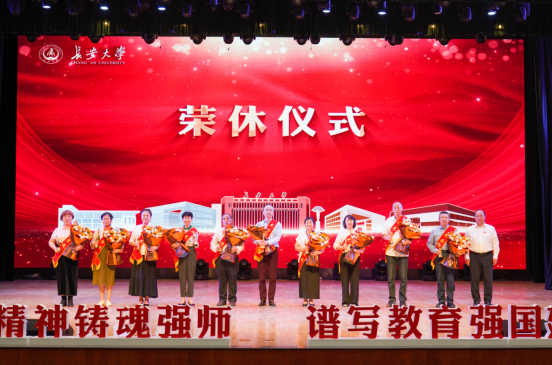 大会还举行了新教工入职仪式,荣休教师代表为新教工代表佩戴校徽并发放《长安大学师德师风教育读本》。
